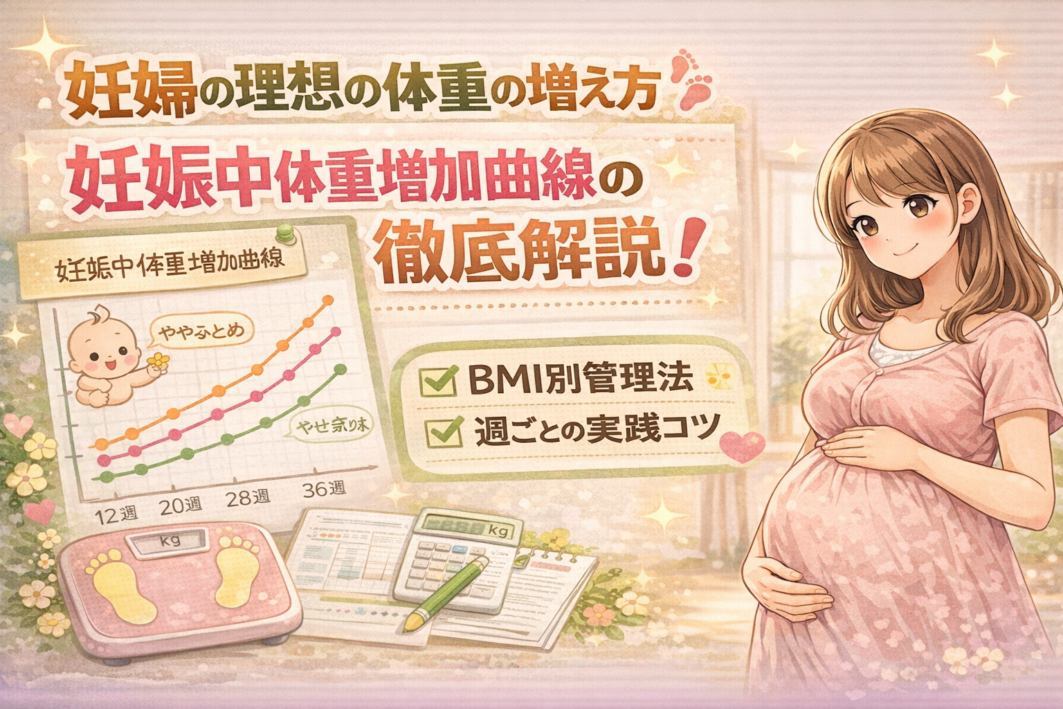 「つわりで体重が減って心配」「食事を減らしても中期以降に急に増えてしまう」など、よくある悩みもサポート。この先を読むと、妊娠週数別の目安や体重管理の工夫、食事や記録アプリの活用法まで、実践的なヒントが手に入ります。